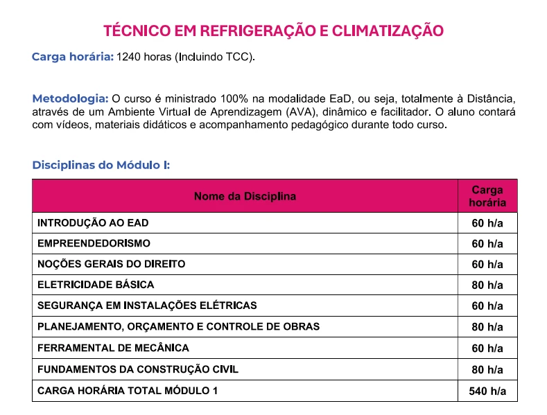 Objetivo do curso : capacitar profissionais para diagnosticar problemas, manutenções preventivas e realizar corretivas, além de instalar sistemas de refrigeração e climatização com segurança e eficiência energética.